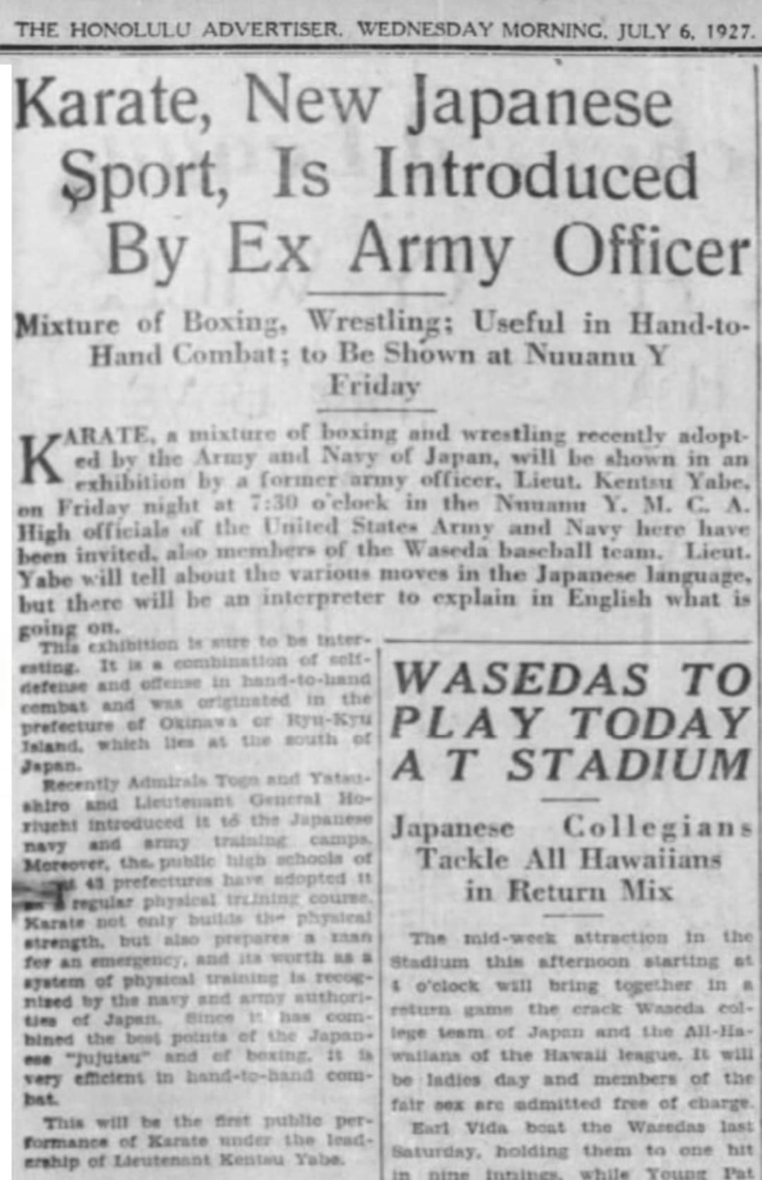 Kárate, una mezcla de boxeo y wrestling adoptada recientemente por el ejército y la marina japoneses, será presentado en una n una demostración por el oficial retirado del ejército, el teniente Kentsu Yabe, el viernes a las 7:30 am en Nuuanu Y.M.C.A. Fueron invitados oficiales de alto rango del Ejército y la Marina de los Estados Unidos, también miembros del equipo de béisbol de Waseda. El teniente Yabe hablará sobre los distintos movimientos en idioma japonés, pero habrá un intérprete para explicar en inglés lo que está sucediendo.