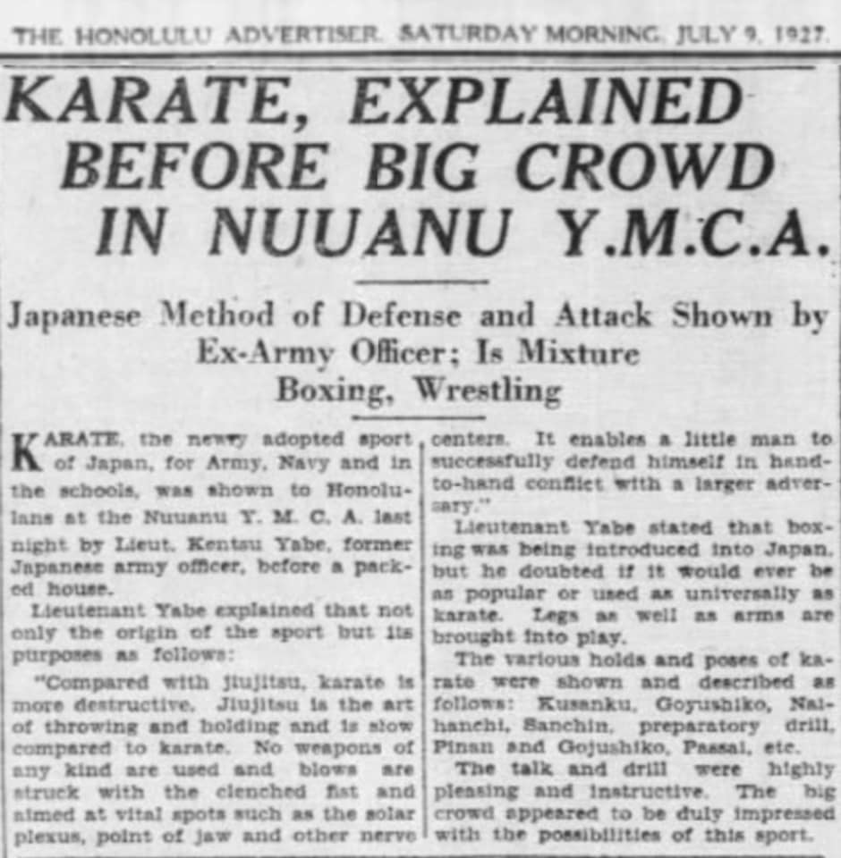 Recientemente, el karateka Gary Suley compartió dos registros históricos notables con la comunidad de Kárate, a pesar de no informar ningún descubrimiento reciente o hechos desconocidos. Estos son dos recortes de periódico sobre una presentación que el maestro okinawense Kentsu Yabu (屋部 憲通, 1866-1937), alumno de Sokon Matsumura y Anko Itosu, hizo en Hawai en 1927. Aparentemente es uno de los primeros registros del término “Kárate” hecho en inglés, incluso antes de la reunión magistral que tuvo lugar en 1936 para cambiar el kanji del arte de 唐手 (Tode/Karate, mano de China) a 空手 (Karate, manos vacías).
